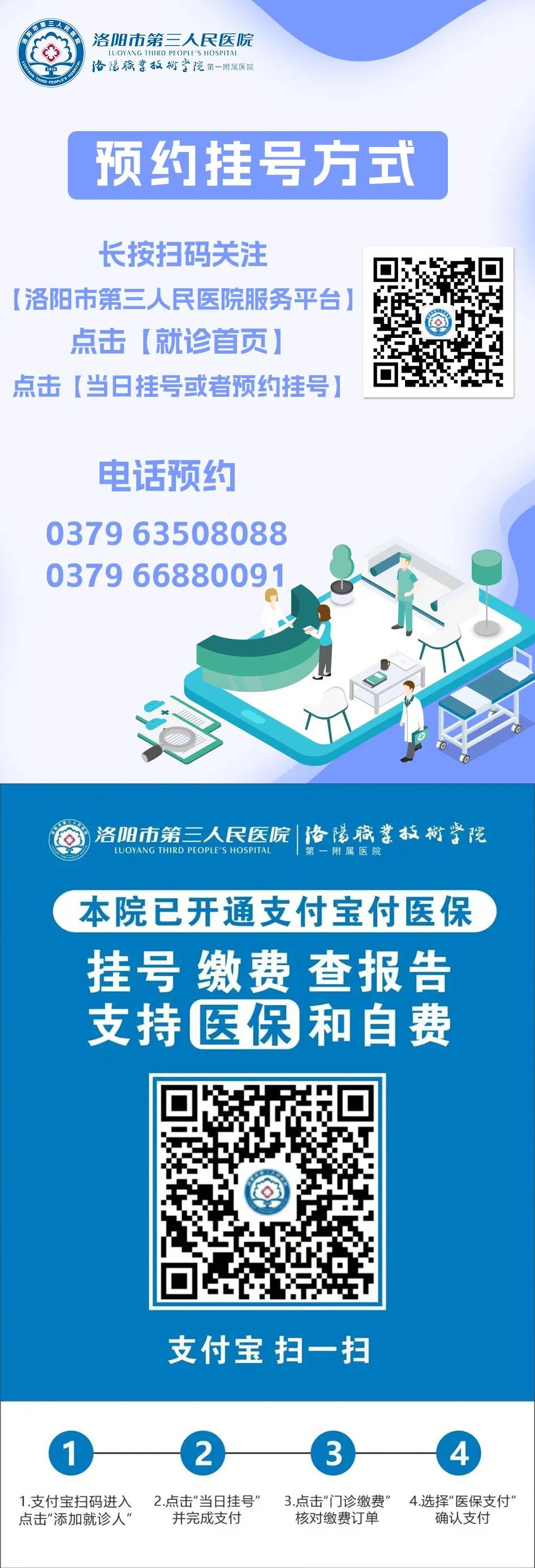 1)、网络预约:搜索“洛阳市第三人民医院官网”或者登录www.lyhospital.com,进入官网平台进行预约。也可以通过“河南省预约挂号服务平台”预约。