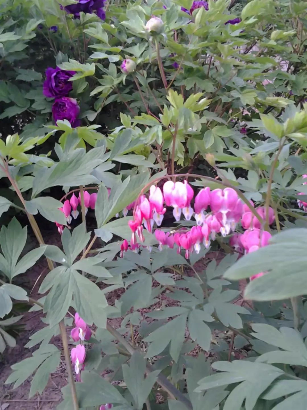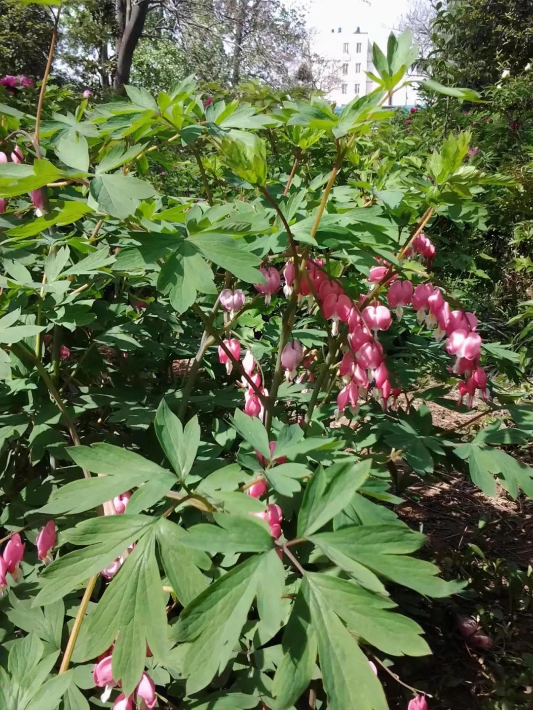 恍惚间,我又觉得这海棠花和我在医院内见过的一株荷包牡丹有几分神似,那是在我院医技楼和住院部A楼之前的花圃之中的“绝色”。要说绝色,其实应该是春天中那花圃中的花开富贵的牡丹,但属“珍奇”就要说这“荷包牡丹”了,虽名为牡丹却非牡丹,因为她的花朵就好像“荷包”一样,故名曰之。只是那“荷包牡丹”多了份艳丽,而这海棠却多了份娴静,这海棠应该属于“海棠四品”中的垂丝海棠了吧。垂丝海棠,顾名思义,具有长长的垂丝状花梗,因此花一般倒垂,区别于西府海棠的花朵颜色更浅,花形更大,花梗直立,开花时远观更为茂盛,垂丝海棠柔蔓近风,垂英袅袅,如怡静而不失淡雅的淑女,但风姿怜人,“她”和西府海棠、木瓜海棠、贴梗海棠并称为“海棠四品”。