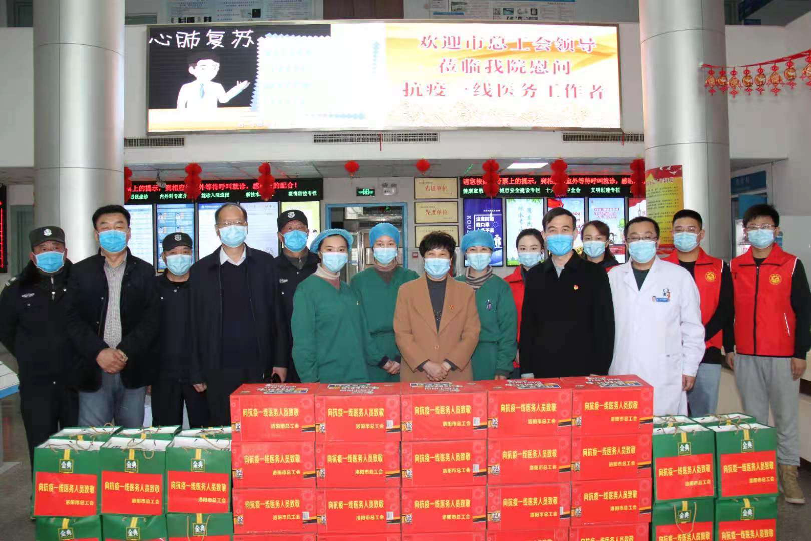 2月7日下午,市总工会女工委员会主任郭俊慧、教科文卫体工会主席韩兵,到洛阳市第三人民医院看望、慰问抗疫一线医务人员,并送上新年祝福和慰问品。