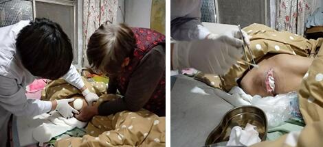 老人伤口复杂情况超出了她们的想象——压疮创面感染、坏死,散发着阵阵恶臭,家人缺乏照护病人的经验,老人半卧在橡胶垫上,裸着下身,臀部架在床洞上……看到这些,大家二话不说,赶忙帮老人铺好了床垫、气垫床,换了干净床单,指导家人给老人擦身体,又将买来的纸尿裤手把手教家人给老人穿上,清洗伤口、消毒、清创、上药……和家属沟通治疗方案、进行饮食和卧床患者宣教指导、教会家人用血糖仪给患者监测血糖等……不知不觉两个半小时过去了,老人的家人不住的感谢,感叹道:“洛阳三院的护士真好!你们真认真!真负责任!”——走出患者家门,虽然已经过了中午一点半,但肚子一点儿也不觉得饿!来时路上的寒风也不觉得刺痛了,同志们的脸居然还红扑扑的。
