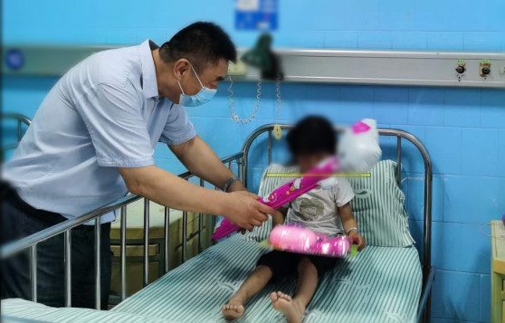 “六一”上午一上班,院长杨致远、副院长马辉、工会主席段言文就带领相关人员来到儿科和康复医学科儿童病区,看望慰问节日住院的小患者,并为他们送上了节日礼物。