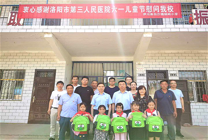 “六一”儿童节上午,院党委书记马伟、工会主席段言文、女工委员会主任何红梅、经济审查委员会主任许军红带着全院职工的一片爱心来到医院帮扶村伊川县杨岭村村小学,为117名农村留守儿童送上了礼物,并和他们一起共度“六一”儿童节。