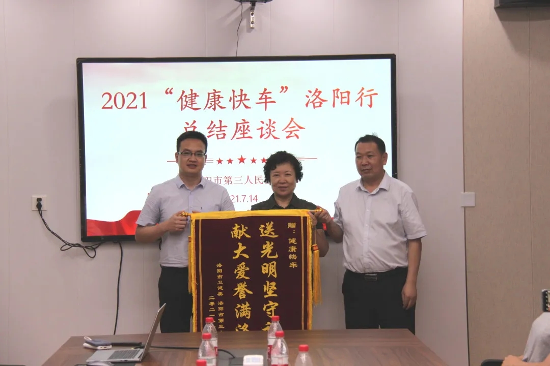7月14日下午,洛阳市第三人民医院召开2021“健康快车”总结座谈会,卫健委领导、健康快车全体人员、基地医院领导及医院参与快车活动的工作人员参加了座谈会,对健康快车洛阳行工作进行总结,与会人员共同回顾了健康快车在洛期间的工作和感受,为本次“健康快车”洛阳行活动画上圆满句号。