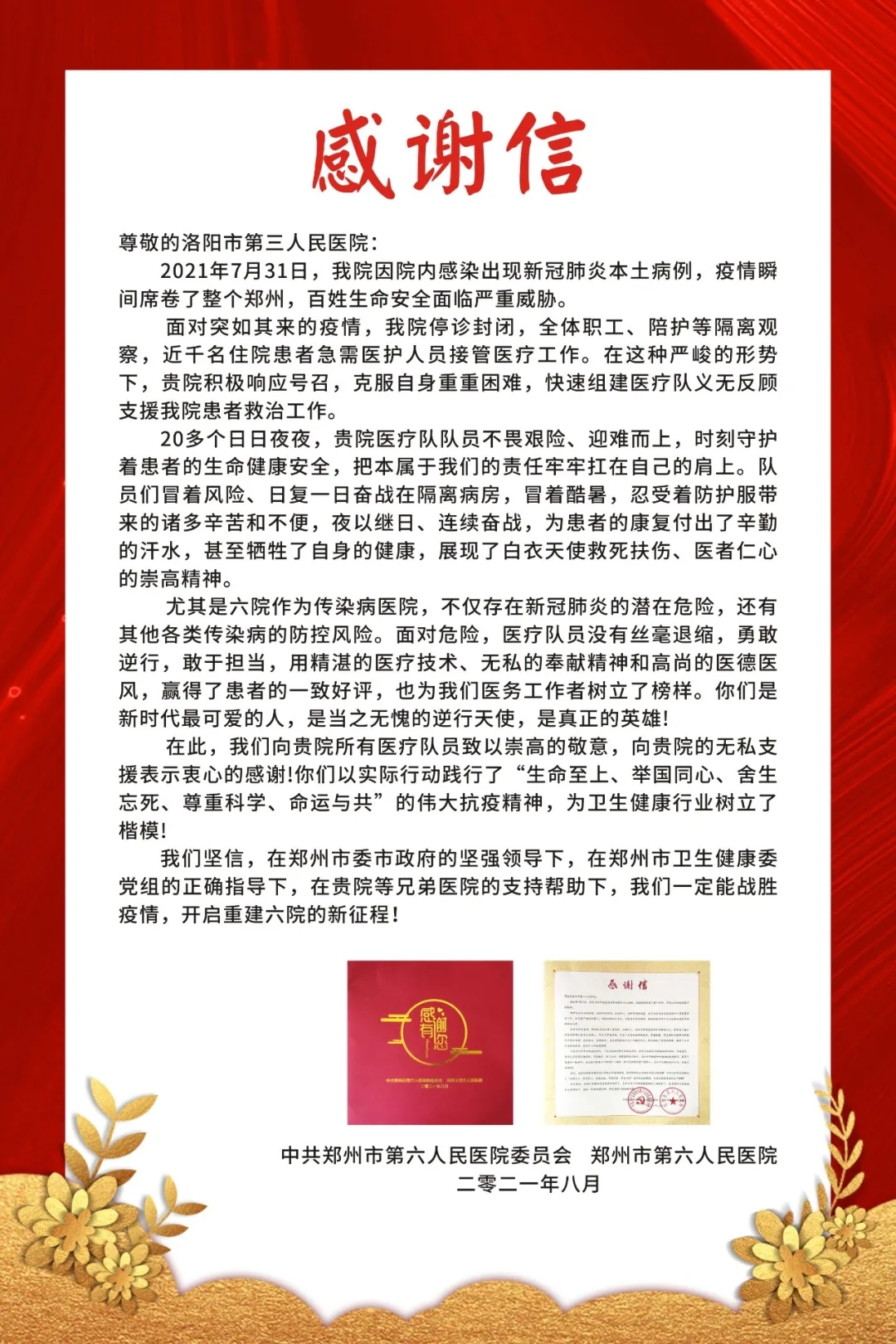 伴随着医疗队员的归来,郑州六院的感谢信也同时寄到了医院。