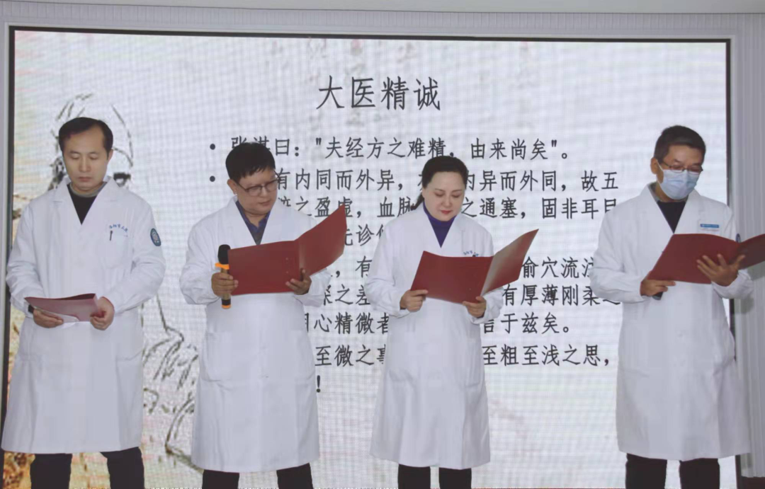 “凡大医治病,必当安神定志......”,四名传承老师依次诵读中医经典《大医精诚》,告诫我们“医者,重于医术,根在医德与仁心”。