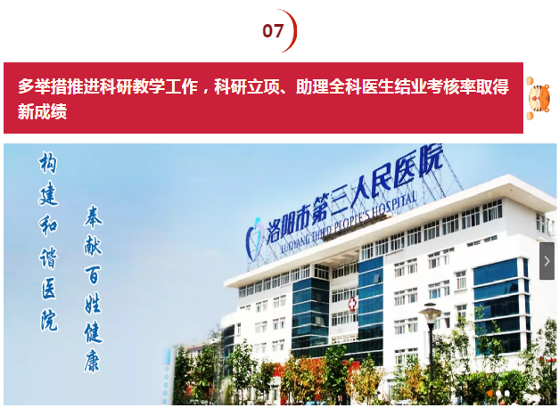 我院多举措推进科研教学工作,建立健全医院科研管理各项制度,完善科研激励政策,推动医院科研工作取得新成绩。2021年全院共发表论文74 篇,其中核心论文4篇;完成国家工信部科研立项1项(常书锋同志主持《基于智能手机移动终端、赋能百万村医的眼科诊断解决方案》),河南省科研立项2项,洛阳市科研立项1项,结题并通过验收1项;评审通过继续教育项目8 项。2021年完善助理全科医生规范化培训制度,加大考核力度,助理全科医生结业考核通过率95%,在全省63家培训基地中位居第五。