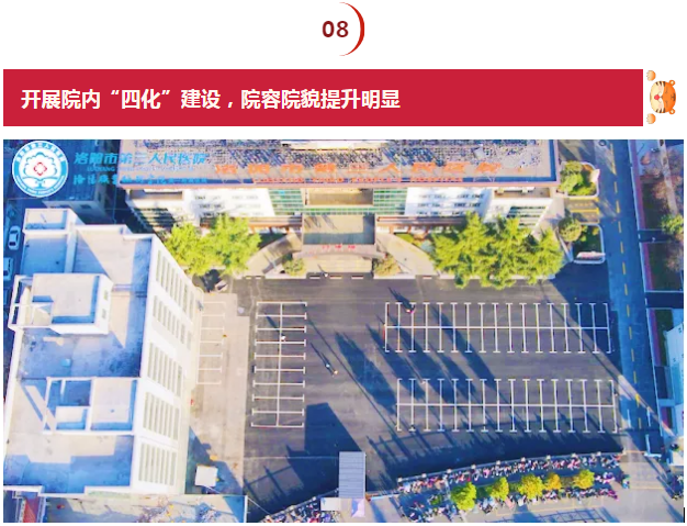 我院开展以“病区舒适化、建筑亮化、路面硬化、院区美化”等为内容的院内环境形象提升行动,完成眼科内部装修及外立面真石漆改造;对社区卫生服务中心外立面真石漆改造,以中医文化为特色装修建设了社区中医馆;发热门诊建成并投入使用;医技楼顶及连廊改造,解决了楼顶防水隔热问题;硬化门诊广场地面及相关通道,新增停车位百余个;开通西大门,疏解院内车流压力;对院内机动车道进行沥青硬化,分区域停放非机动车辆;院内道路加装景观灯并对门诊楼、眼科楼进行整体亮化,让医院晚上亮起来暖起来。院容院貌提升明显,有效改善医院整体环境。