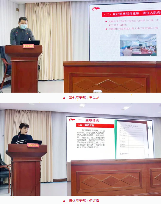 11位党支部书记结合各自工作岗位,从党史学习教育开展情况、履行党建责任情况、政治建设和思想建设工作情况、党建工作与业务工作融合情况、党支部建设情况、党风廉政建设和意识形态工作责任制落实情况、亮点工作和存在的问题、下一步改进措施及计划等方面进行述职,院党员领导干部分别就所联系和组织关系所在党支部的述职情况进行点评,指出存在的问题,明确了努力方向。