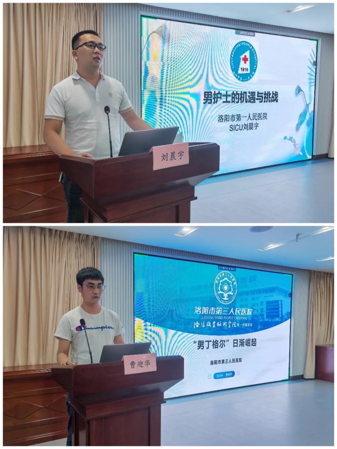 洛阳市第一人民医院SICU男护士代表刘晨宇从自身出发,讲述了男护士在如今护理领域中的优势与遇到的挑战;洛阳市第三人民医院男护士代表急诊科护士曹迎华分享了男护士在当今护理发展中的崛起历程,以及未来的发展。
