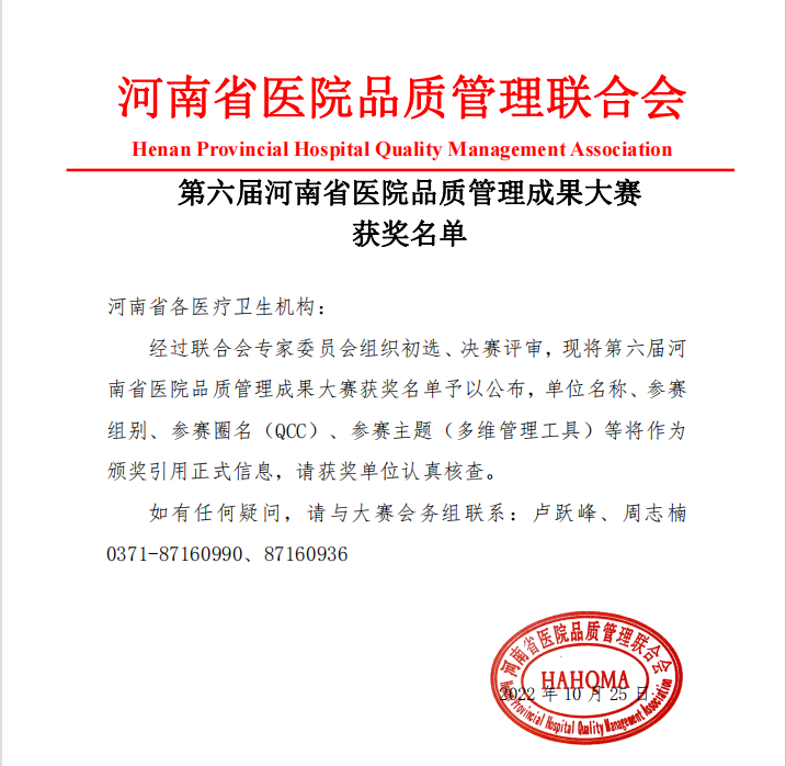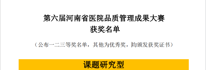 10月25日,河南省医院品质管理联合会公布第六届河南省医院品质管理成果大赛获奖名单,我院再创佳绩,共有4项成果获奖。
