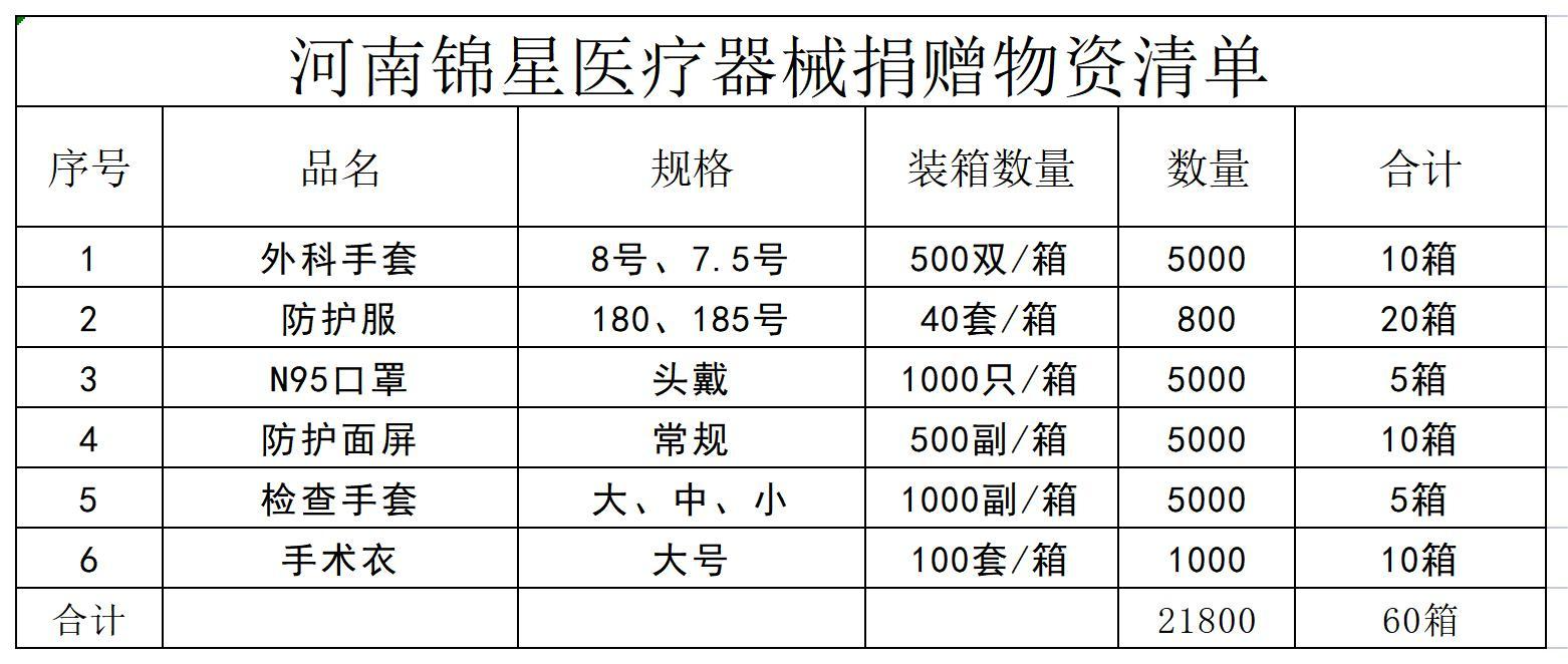 河南锦星医疗器械有限公司用实际行动助力我院疫情防控工作,既是对我院抗疫工作物质上的支持,也是对全体一线抗疫人员的精神鼓励,充分彰显了企业的社会担当和为民情怀。下一步,我院将按照有关规定,第一时间将物资投放至一线抗疫工作中,同时精细落实各项防控措施,坚决守住来之不易的防控成果,为保障全市人民群众身体健康和生命安全作出更大贡献。