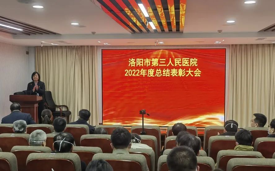 副院长王建丽同志宣读《洛阳市第三人民医院关于表彰2022年度先进集体和先进个人的决定》,院领导班子为27个先进集体、80名先进个人进行颁奖。