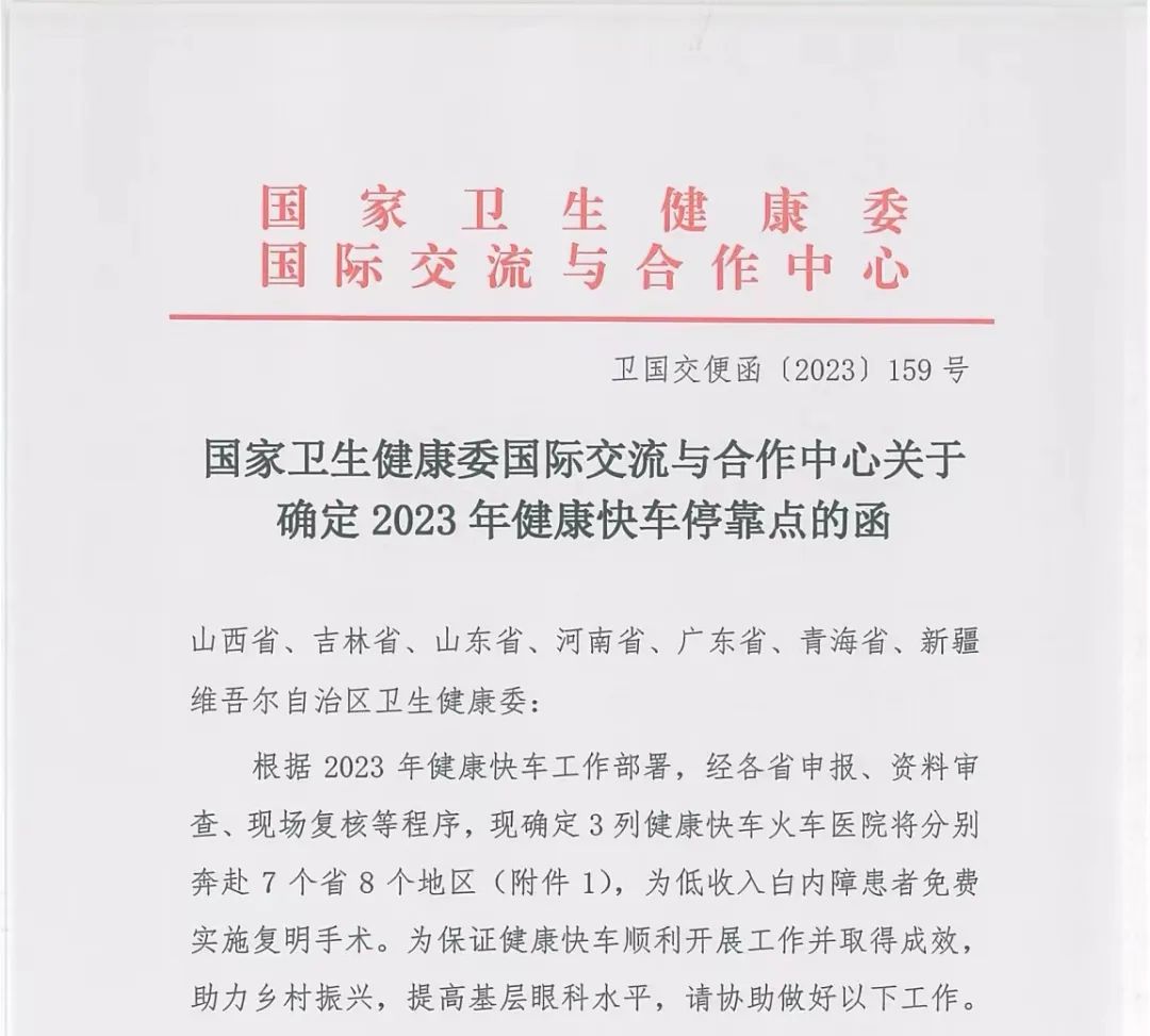 “健康快车”是1997年香港回归时,由香港同胞捐赠给祖国的礼物。是经特别设计建造的专门从事白内障手术的流动的眼科列车医院。截止到2022年1月,三列健康快车已行程55余万里,到过28个省市自治区,共计196站,共有280多位国家级医疗团队走上健康快车,为白内障患者实施复明手术22万例,使他们重见光明。