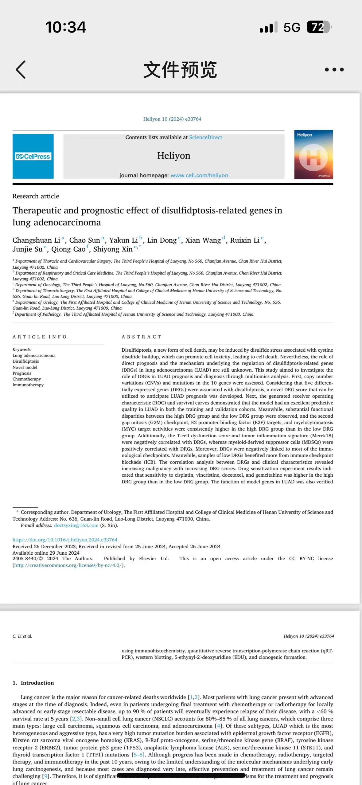 近期,我院胸心外科副主任医师李长栓以第一作者的身份在国际期刊(Heliyon)成功发表了一篇SCI论文 ——《双硫死亡相关基因在肺腺癌的治疗及预后效果》,该论文的影响因子达 3.4。