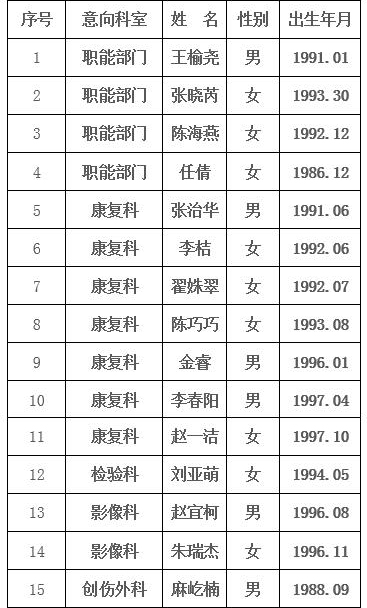 根据《洛阳市第三人民医院2020年度招聘公告》,经过报名、资格审核、考试及面试等程序,现将2020年度一月份的招聘录用结果予以公示(见附表)。 报到程序: 1、试工。试工期为一周,请已录用人员尽快来院试工。 2、体检。体检合格进入签约程序。 3、签约。有工作经验的实用型人才可以直接入职办理相关手续;应届毕业生签订毕业生就业协议书,可以在毕业后来院办理入职相关手续。