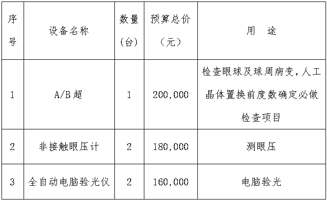 本次招标范围包括A/B超1台、非接触眼压计2台、全自动电脑验光仪2台的采购、安装、调试、验收、培训、质保期内外服务、与货物有关的运输和保险及其他伴随服务等。