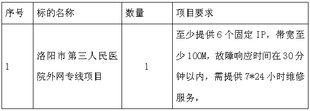 洛阳市第三人民医院拟对外网专线项目进行采购,现欢迎合格的供应商前来参加。