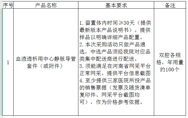 洛阳市第三人民医院(洛阳职业技术学院第一附属医院)血液净化室需要将现用的血液透析用中心静脉导管(临时)更换为能在体内留置时间更长的临时导管,现公开遴选符合要求的产品,欢迎符合资质要求及具备供货能力的商家参加。