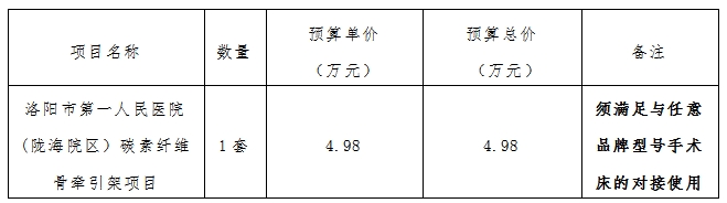 洛阳市第一人民医院(陇海院区)现公开采购碳素纤维骨牵引架一套,具体事宜公告如下。