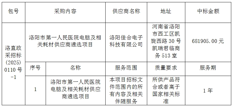 本项目为洛阳市第一人民医院电脑及相关耗材供应商遴选项目,共一个包。为了增加竞争机制提高服务质量、降低采购成本,拟遴选两名供应商,分别为主要供应商和备用供应商,对电脑、打印机、耗材进行配送、维修和维护,协助处理网络、软件等其他相关维护工作;质量要求:所供产品符合或者高于国家相关标准;服务期:1年;质保期:电脑整机质保1年,核心部件质保3年,其余固定资产类产品整机质保1年,外置设备及配件类质保1年;合同履行期限:服务期 质保期。