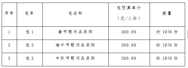 1)项目概况:本项目为洛阳市第一人民医院2026年工会会员传统节日慰问品采购项目。主要采购内容包含春节、端午、中秋节日慰问品。院工会总人数约1976人。其中,中州院区约951人,陇海院区约1025人。本项目分为3个标包:包1为春节慰问品采购,包2为端午节慰问品采购,包3为中秋节慰问品采购,具体内容详见询比文件。
